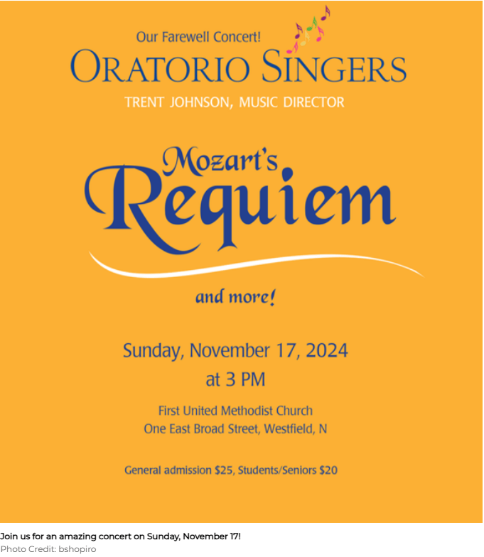 - Details: Experience an evening of choral masterpieces performed by the Oratorio Singers. For tickets and more information, visit oratoriosingerswestfield.org.